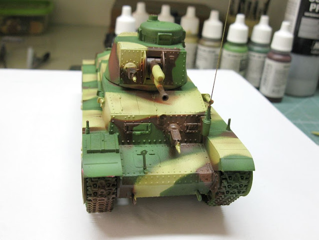 After sanding the German decals, I decided to paint the tank on the old painting. The old finish was made in extremely tough automotive enamel. After a research, I decided to make in the Czech tank the top and colorful cammo of three colors: Skoda LT vz.35 of Slovak Prapor Utocnej Vozby - Tank Battailon - Rapid Brigade. Ukrainian front, 1941. The profile is this:
