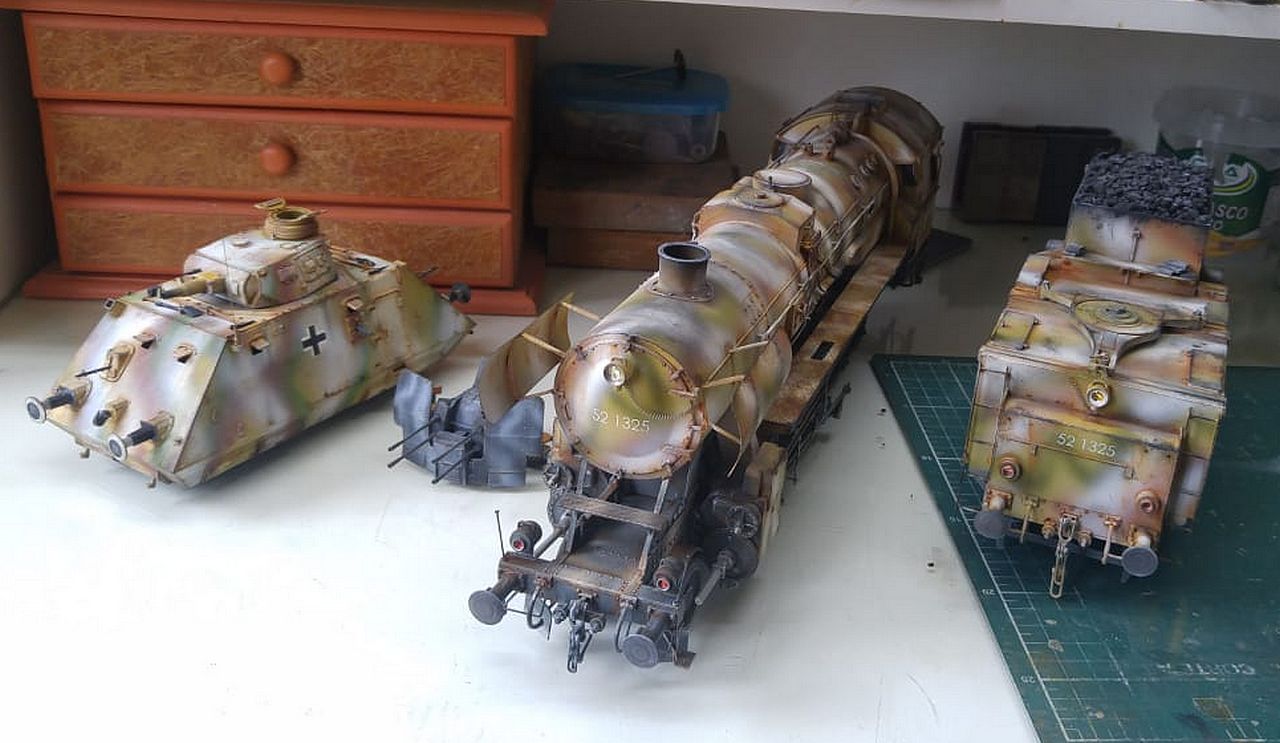 And finally the train composition is ready!! Here is the Kriegslokomotive Baureihe 52 (and Schwerer Spähzug Artilleriewagen s.Sp.), who are now going to their final station, towards the south of Brazil. Bon voyage, mates !!! Let the Typhoons, Mustangs and Tunderbolts not find you on the way !!! Full steam ahead!!!